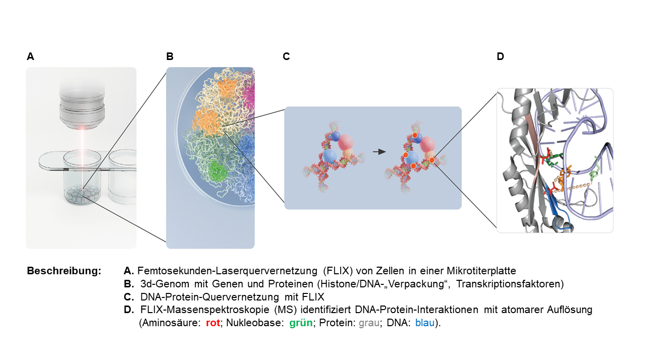 DNA–Protein-Wechselwirkungen steuern zelluläre Prozesse und spielen eine zentrale Rolle bei der Entstehung von Krankheiten. Diese Bindungen sind oft schwach und erfordern chemische Fixierung – ein langsamer, unspezifischer Eingriff. FLIX-MS ist eine neuartige Technologie zur Analyse dieser Wechselwirkungen mit atomarer Präzision. Mittels Femtosekundenlaserpulsen (FLIX) werden sie in Echtzeit eingefroren und anschließend per Massenspektrometrie (MS) hochauflösend entschlüsselt. FLIX-MS ist hochspezifisch, zellschonend und eröffnet neue Wege in der medizinischen und pharmazeutischen Forschung.